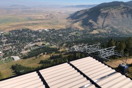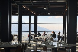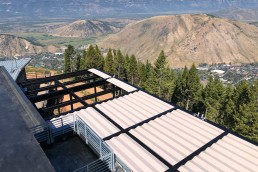 To complement this unique mountaintop experience, Aurora partnered with ShadeFX to craft a versatile outdoor dining area that enhances both comfort and aesthetics. The installation features over 2,600 sq. ft. of retractable roof coverage, including multiple structures equipped with integrated gutters for efficient water management. Retractable glass walls further extend the usability of the space, allowing guests to dine comfortably while remaining connected to the natural surroundings. Finished in Ferrari Sandy Beige fabric with Traffic Black powder-coated framing, the system seamlessly complements the restaurant’s contemporary alpine architecture.